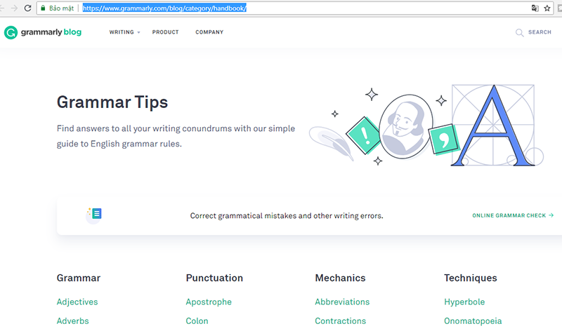 Tuy nhiên, bạn có biết, trang này cũng cung cấp các bài học ngữ pháp cực chất. Khi vào trang chủ, bạn kéo xuống chân trang, ở phần Services sẽ có mục Handbook (https://www.grammarly.com/blog/category/handbook/).