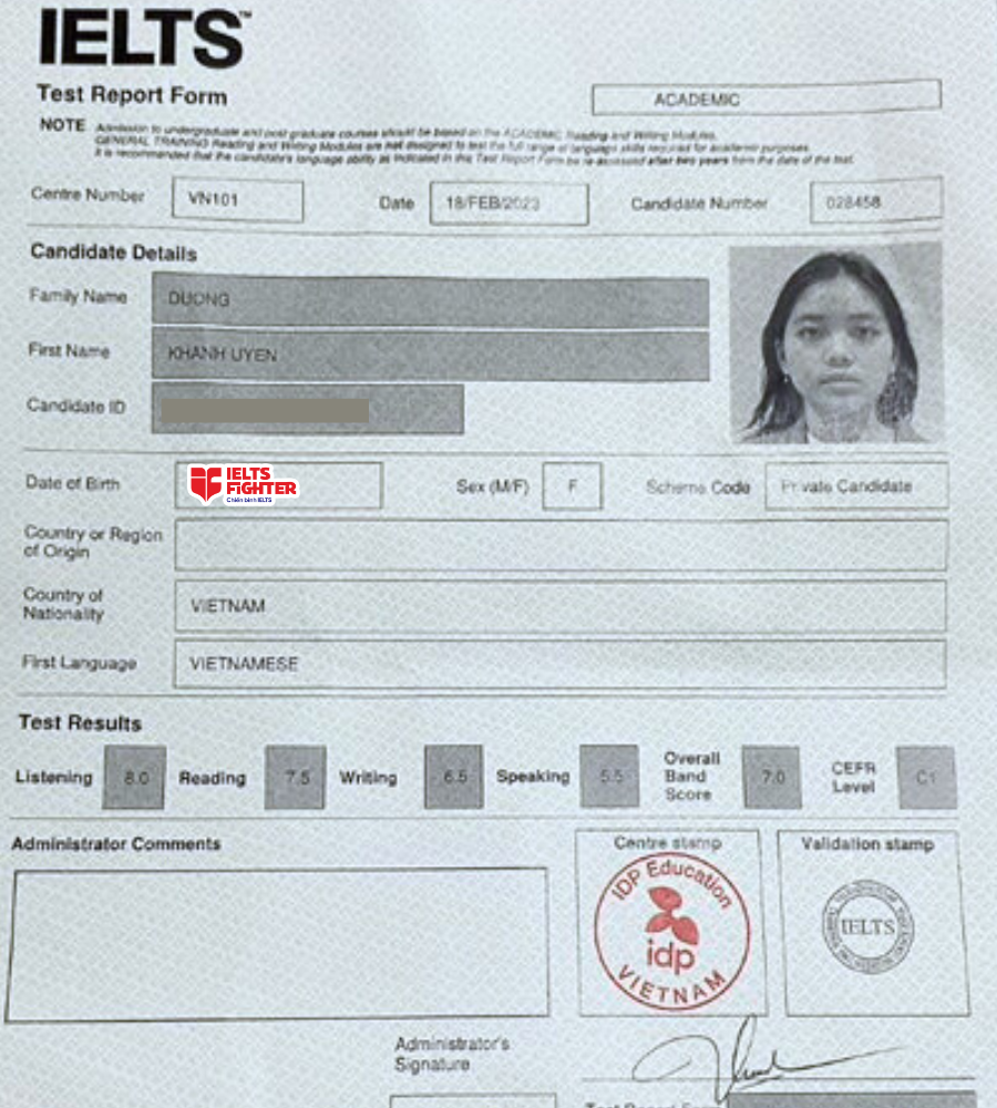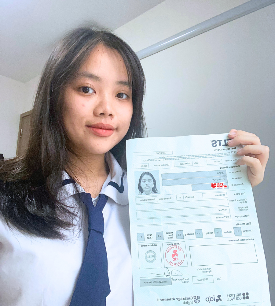 Dạ xin chào mọi người. Em là Uyên học tại IELTS Fighter Bà Hom ạ. Em vừa thi ngày 17,18/2 và đạt kết quả overall 7.0 ạ.