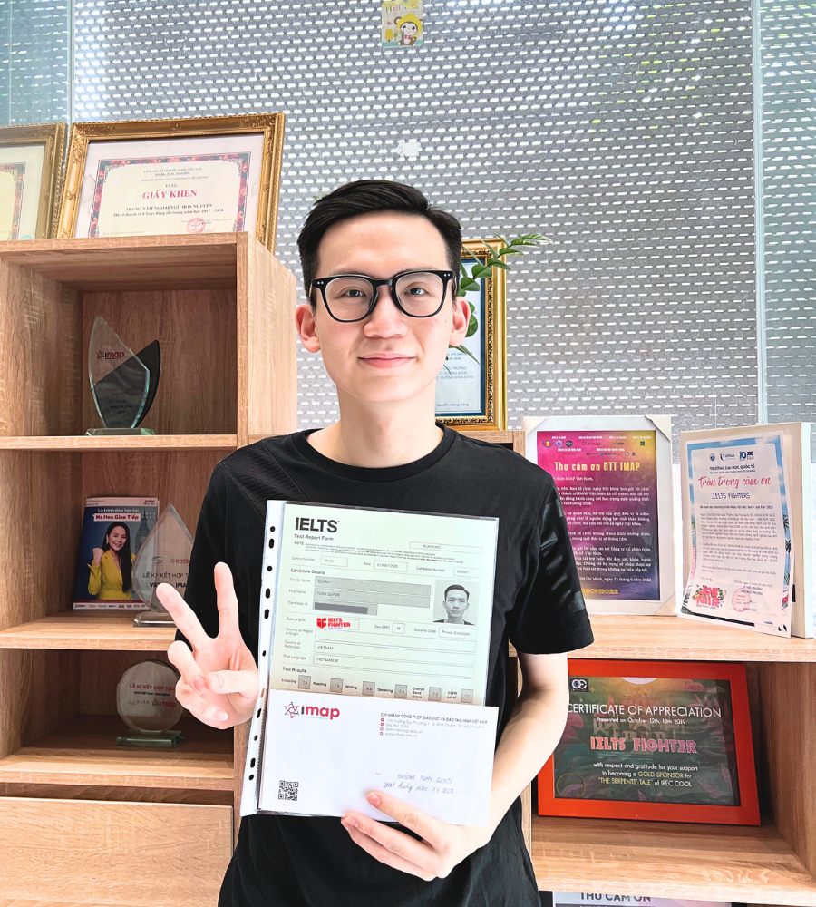 Ngày nhận được kết quả, mình khá là vui với 9.0 Listening, 8.5 Reading cũng như 7.0 phần Writing và cuối cùng là 6.0 Speaking. Tuy có chút thiếu may mắn khi thi Speaking nhưng kết quả vẫn khiến em cảm thấy hài lòng. Cảm ơn đội ngũ của IELTS Fighter Bà Hom đã giúp em đạt được mức điểm mong muốn trong thời gian gấp rút như vậy. Em và các thầy cô đều rất vui vì công sức của mọi người đã được đền đáp.