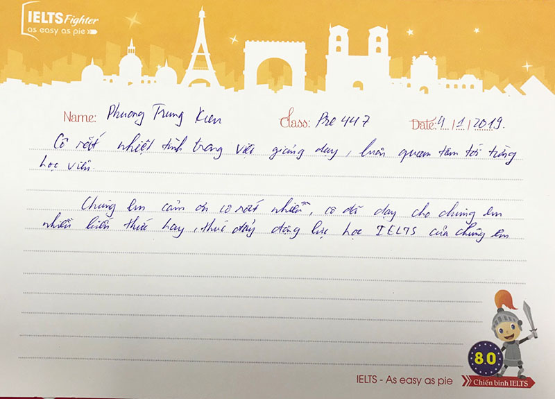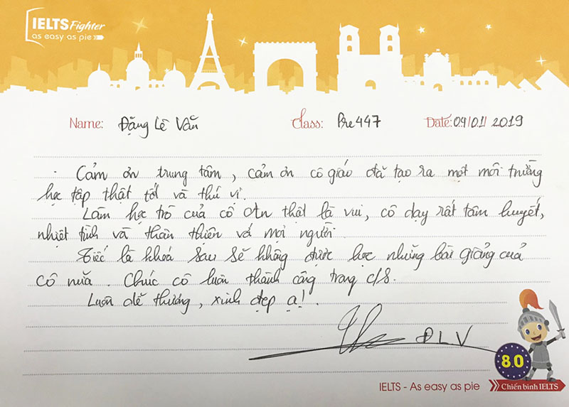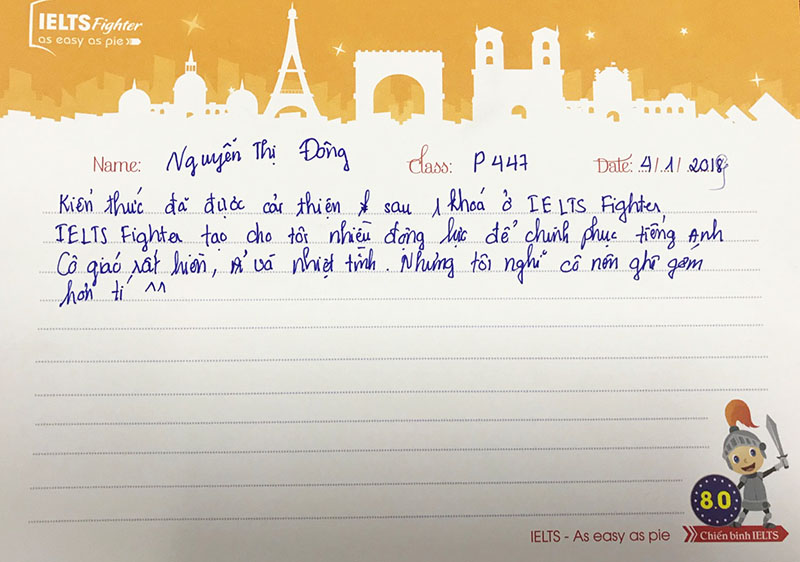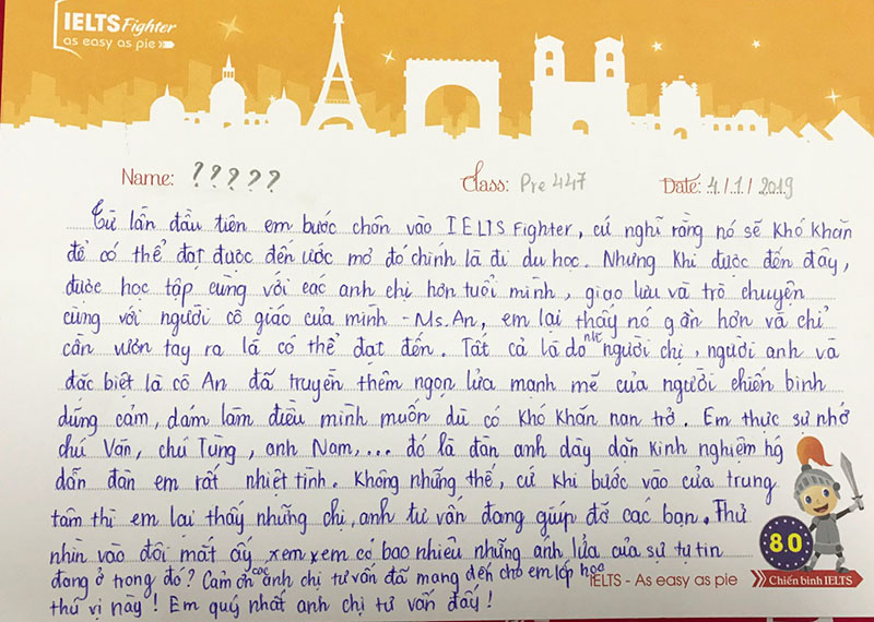 Một tâm thư rất dài nhưng từ một bạn không đề tên. Có thể là ngượng :)). Lời cảm ơn sâu sắc gửi đến cô giáo, đội ngũ tư vấn viên, các anh chị trong lớp của bạn là lời động viên giúp IELTS Fighter tiếp tục phát triển, cố gắng hơn nữa trong tương lai.