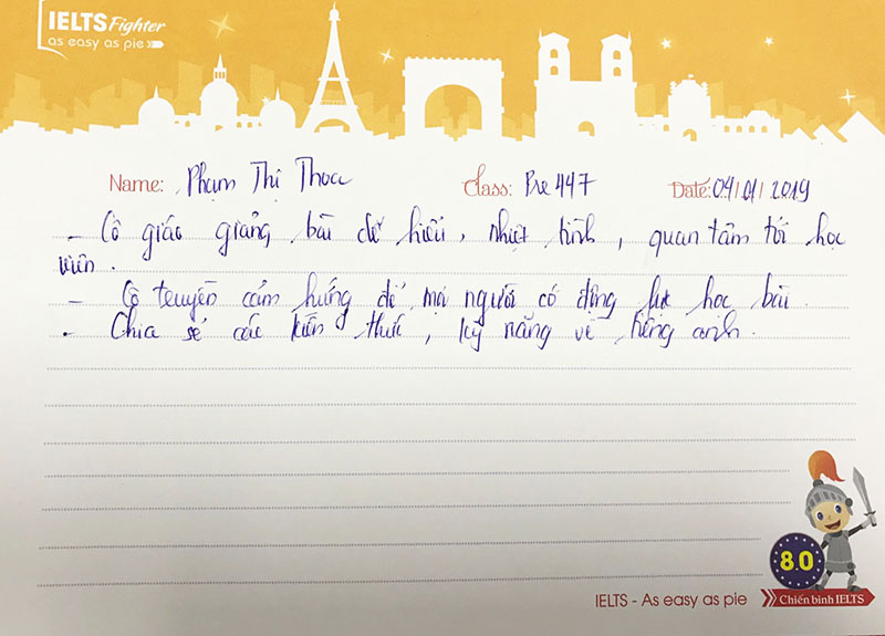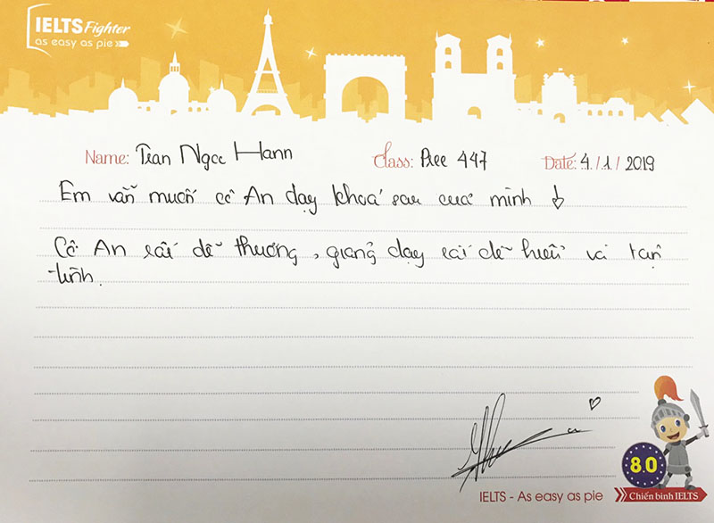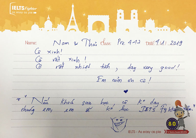 Thêm hai bạn chỉ dành tâm thư để khen cô An xinh rất xinh và dọa nếu không học cô sẽ không học nữa. Bạn Nam - Thảo hiện đang theo học khóa tiếp theo và hài lòng với giáo viên trung tâm. Nhưng tình cảm dành cho cô An - người nâng đỡ và truyền cảm hứng học tiếng Anh IELTS đầu tiên sẽ luôn còn mãi.