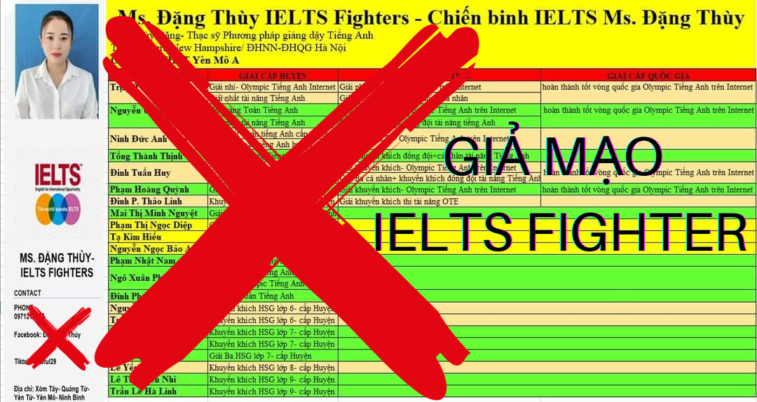 Hiện tại IELTS FIGHTER nhận được nhiều thông tin về cá nhân, tổ chức giả mạo IELTS FIGHTER để quảng cáo, thực hiện tuyển sinh, lôi kéo phụ huynh, học sinh.