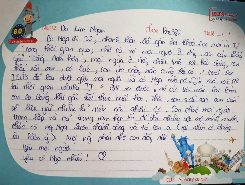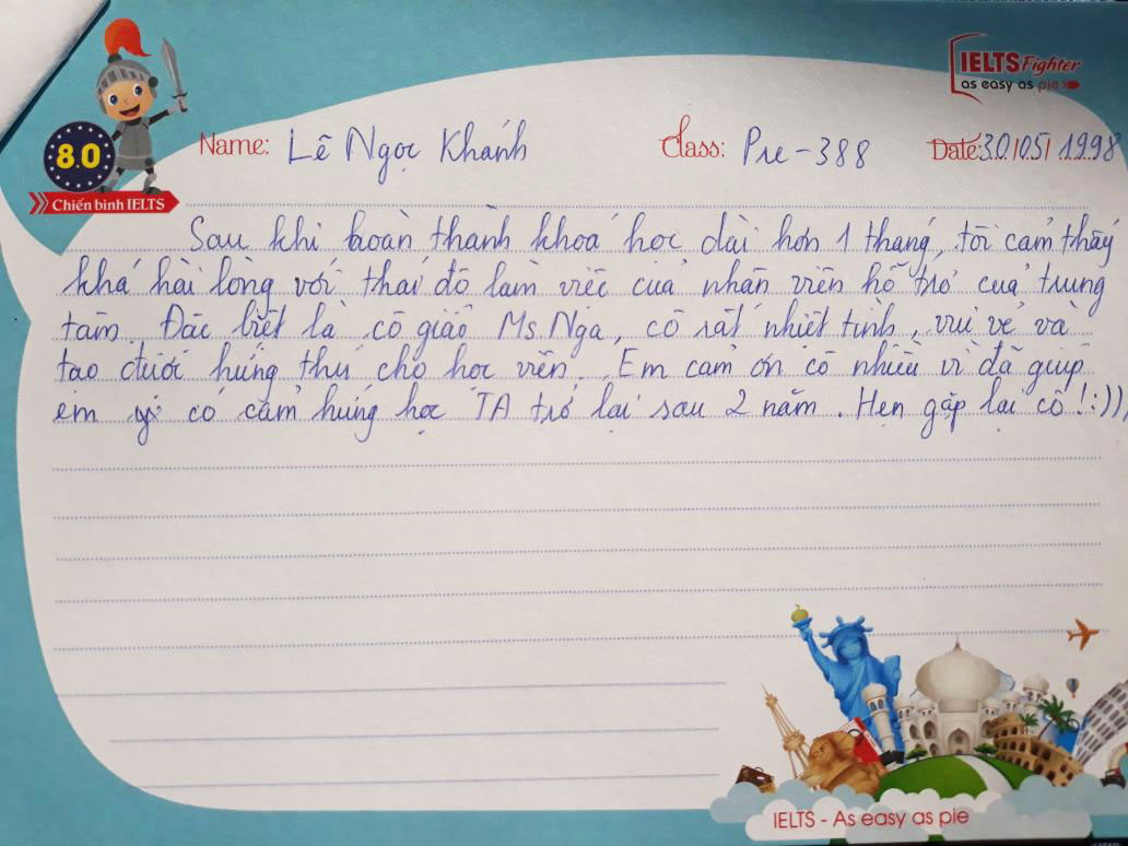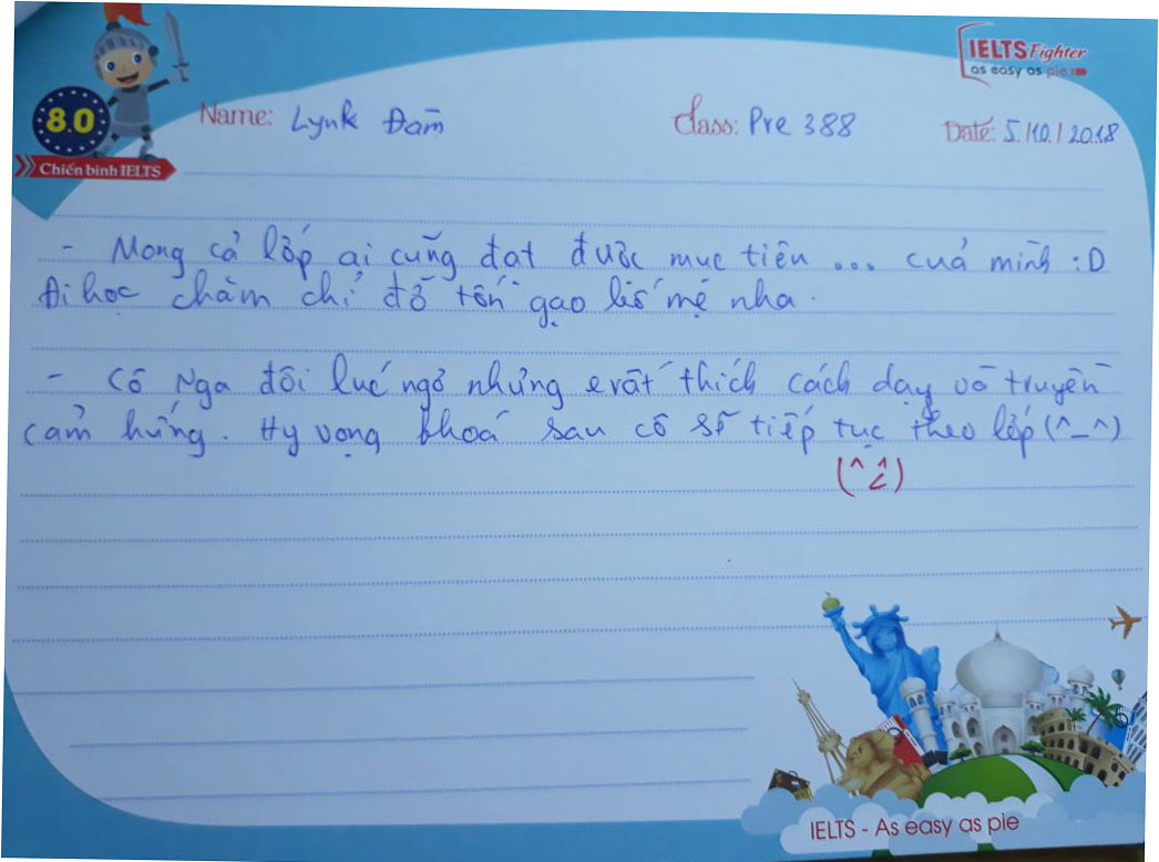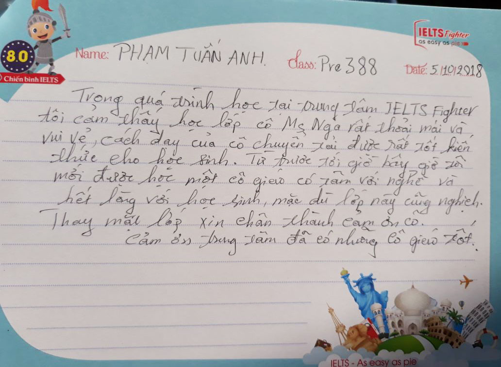 Mỗi một lần kết thúc một lớp học, những kỷ niệm còn đọng lại trong mỗi người là những cảm xúc trong trẻo xen lẫn nỗi buồn vì phải chia xa. Lớp Pre 388 của Ms.Nga cũng như thế. Đong đầy yêu thương qua từng nét bút, các bạn gửi tới IELTS Fighter những lời tâm sự và dễ thương. Cảm ơn các bạn đã lựa chọn IELTS Fighter, cảm ơn các bạn đã chọn trung tâm để đồng hành trên chặng đường chinh phục IELTS này. Chúc các bạn thành công trong tương lai.