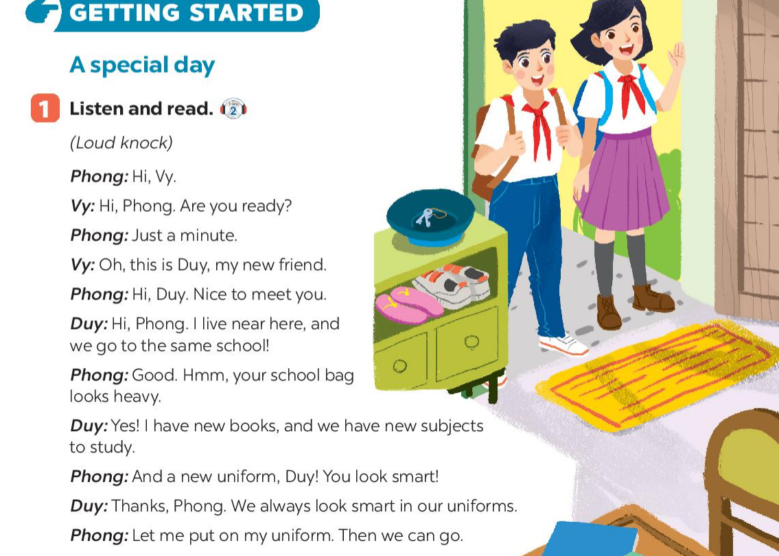 Phong: Để tớ mặc đồng phục. Sau đó chúng mình có thể đi nhé.