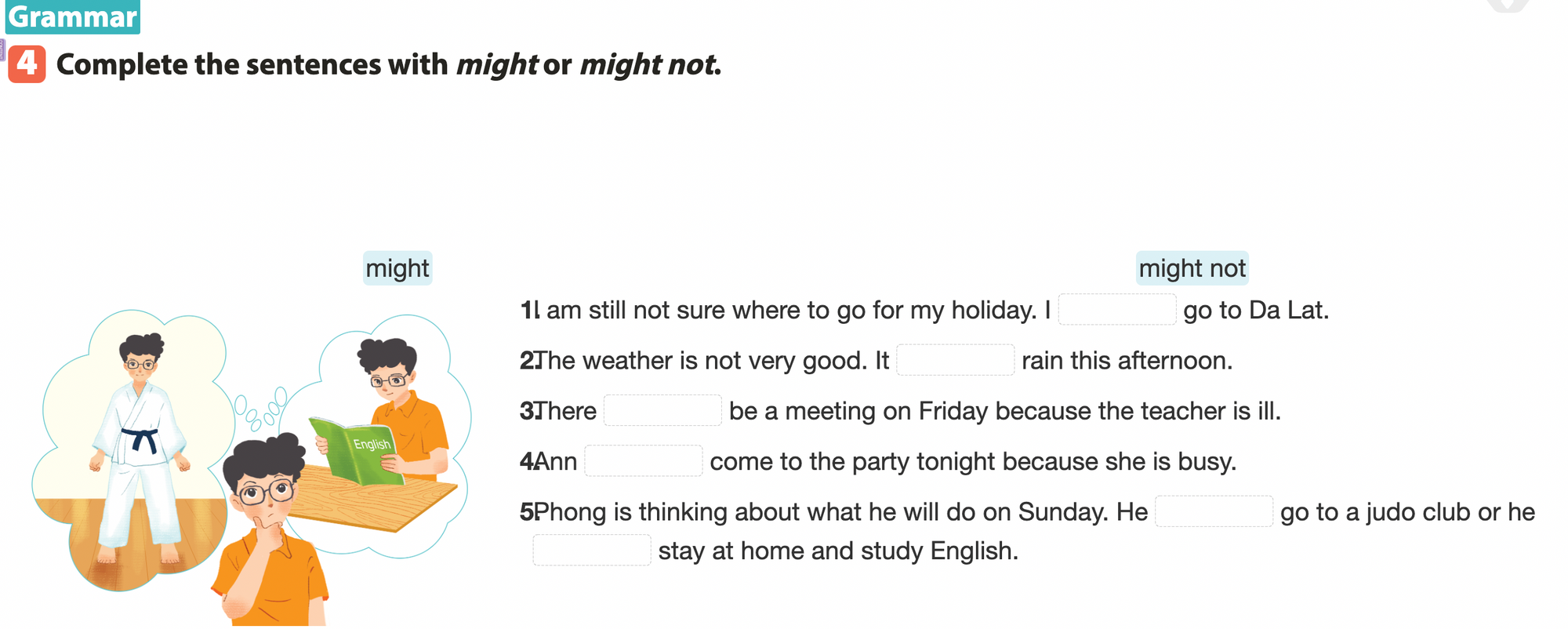 5: Phong is thinking about what he will do on Sunday. He might go to a judo club or he might stay at home to study English.