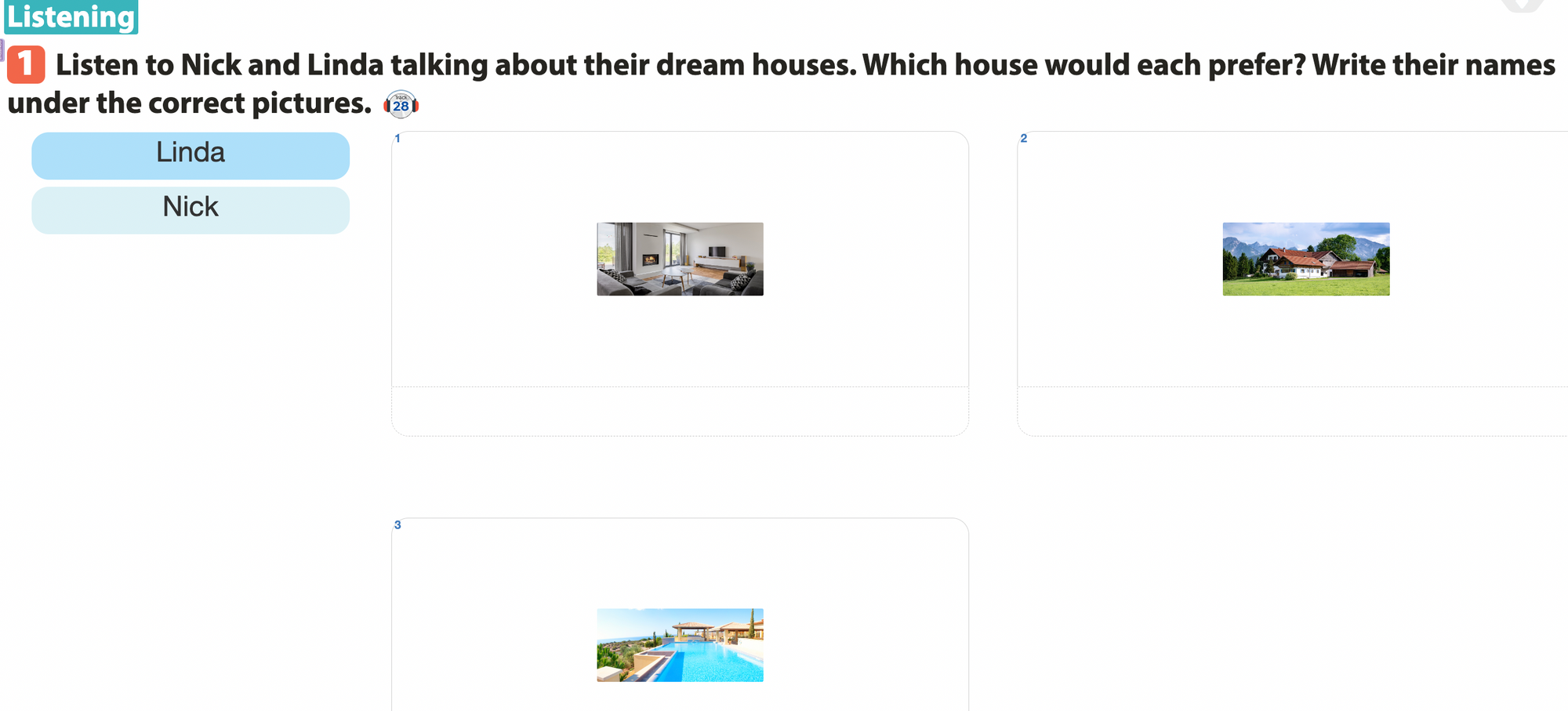 Bài 1. Listen to Nick and Linda talking about their dream houses. Which house would each prefer? Write their names under the correct pictures.