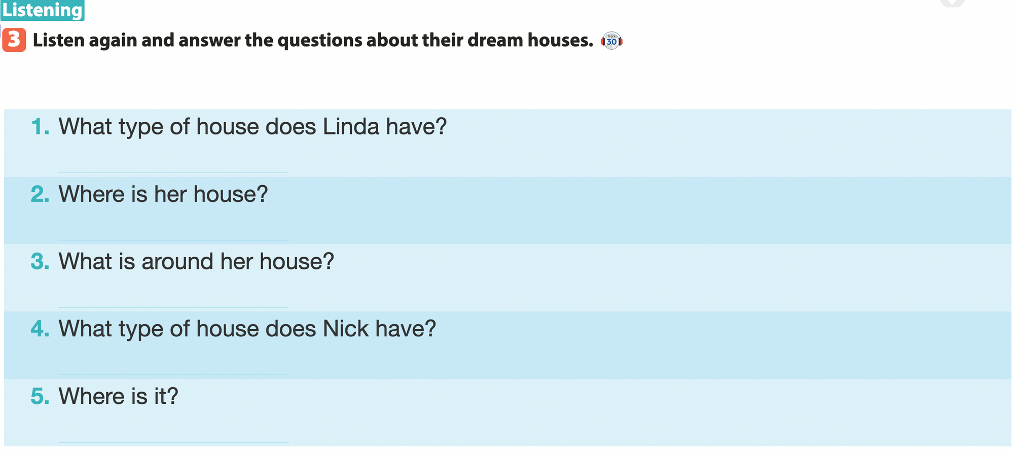 (Nghe lại và trả lời các câu hỏi về ngôi nhà mơ ước của họ)