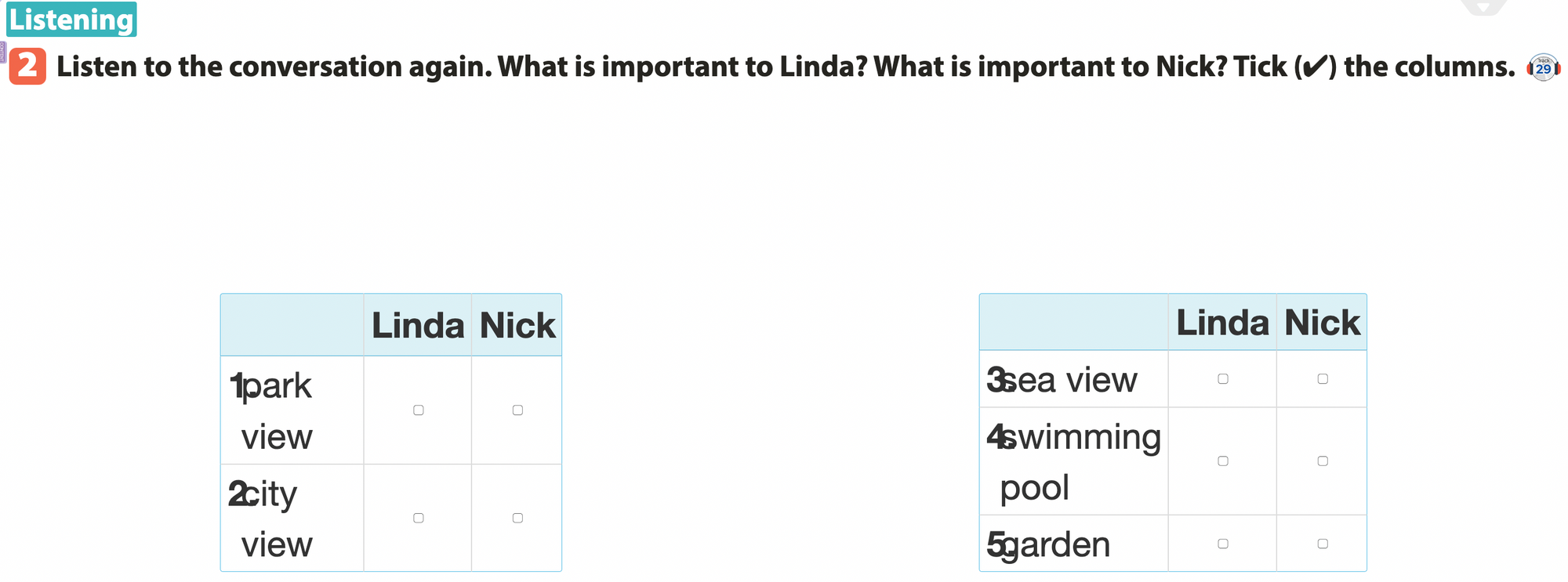 Bài 2. Listen to the conversation again. What is important to Nick? Tick the columns.