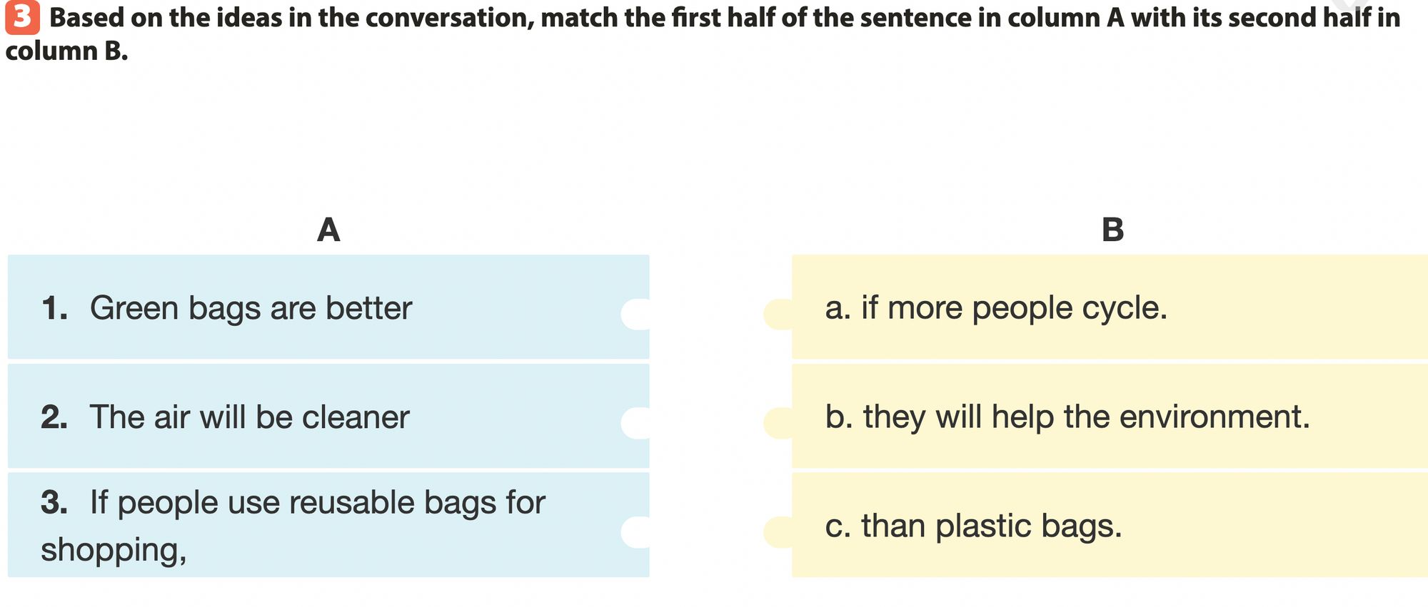 Bài 3. Based on the ideas in the conversation, match the first half of the sentence in column A with its second half in column B.