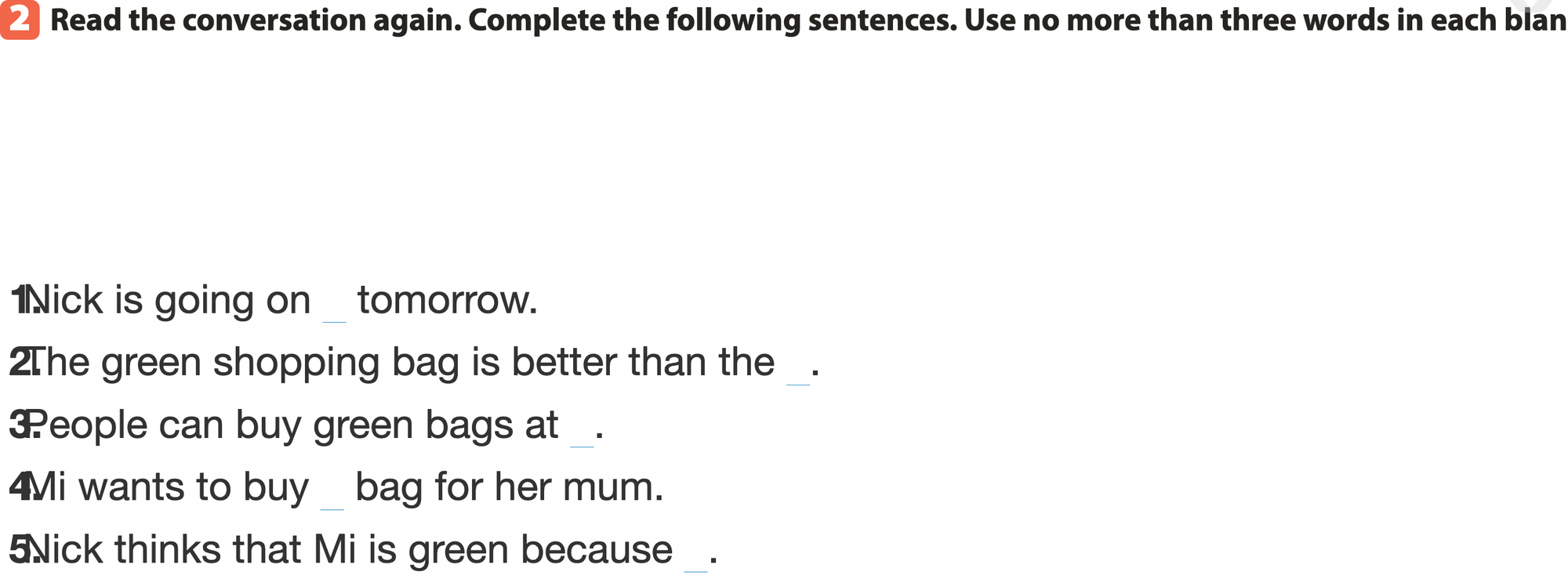 Bài 2. Read the conversation again. Complete the following sentences. Use no more than three words in each blank.