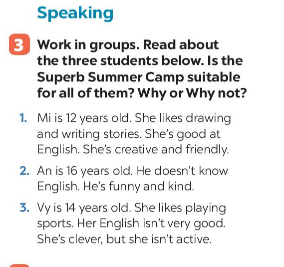 Bài 3. Work in groups. Read about the three students below. Is the Superb Summer Camp suitable for all of them? Why or Why not?