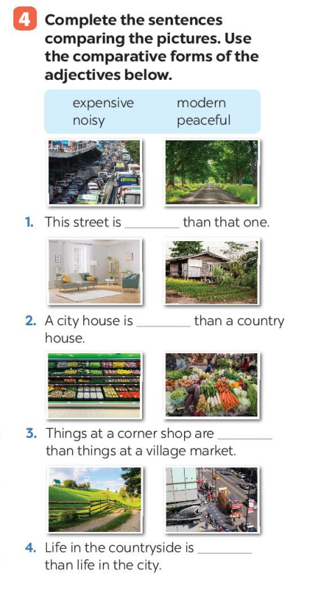 Bài 4: Complete the sentences comparing the pictures. Use the comparative forms of the adjectives below.