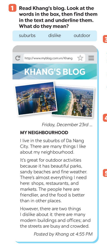 Bài 1: Read Khang’s blog. Look at the words in the box then find them in the text and underline them. What do they mean?