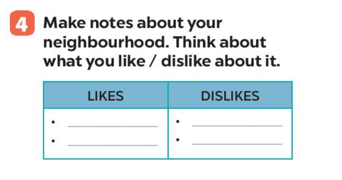 Bài 4. Make notes about your neighbourhood. Think about what you like/ dislike about it.