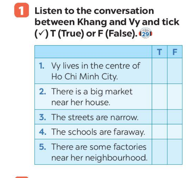 Bài 1: Listen to the conversation between Khang and Vy and tick (✔) T (True) or F (False).