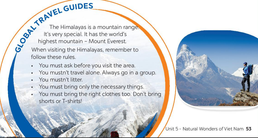 Himalayas là một dãy núi. Nó rất đặc biệt. Nó có ngọn núi cao nhất thế giới - Đỉnh Everest. Khi đến tham quan Himalayas, hãy nhớ tuân theo những quy tắc sau: