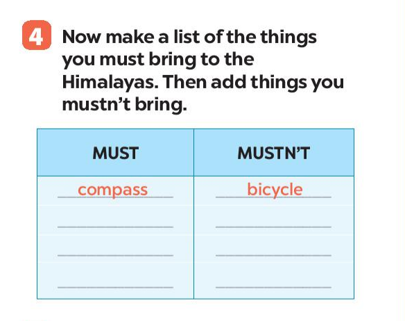 Bài 4. Now make a list of the things you must bring to the Himalayas. Then add things you mustn’t bring.