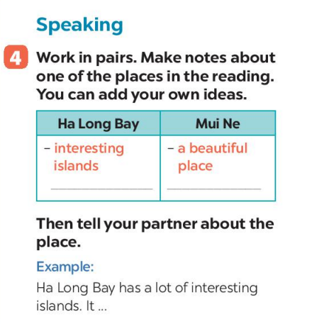 Bài 4. Work in pairs. Make notes about one of the places in the reading. You can add your own ideas. Then tell your partner about the place.