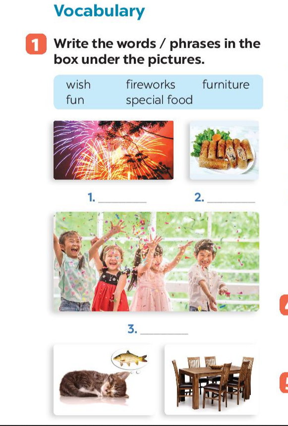 | 1. fireworks | 2. special food | 3. fun | 4. wish | 5. furniture |