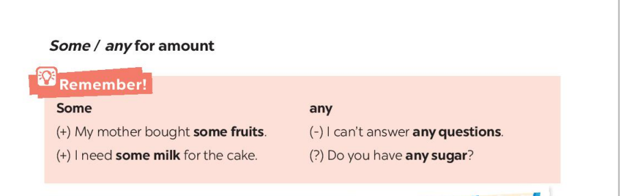 - some + danh từ không đếm được/ danh từ số nhiều: thường dùng trong câu khẳng định