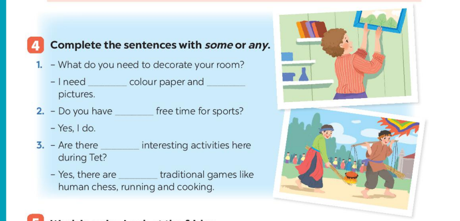 (Trẻ nhỏ nên giúp bố mẹ dọn dẹp nhà cửa.) - People do a lot of shopping before Tet.