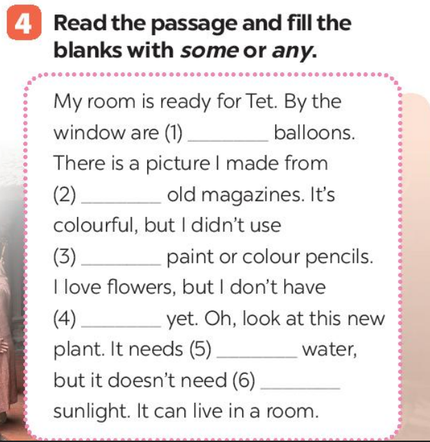 (Đọc đoạn văn và điền vào chỗ trống với some/any)