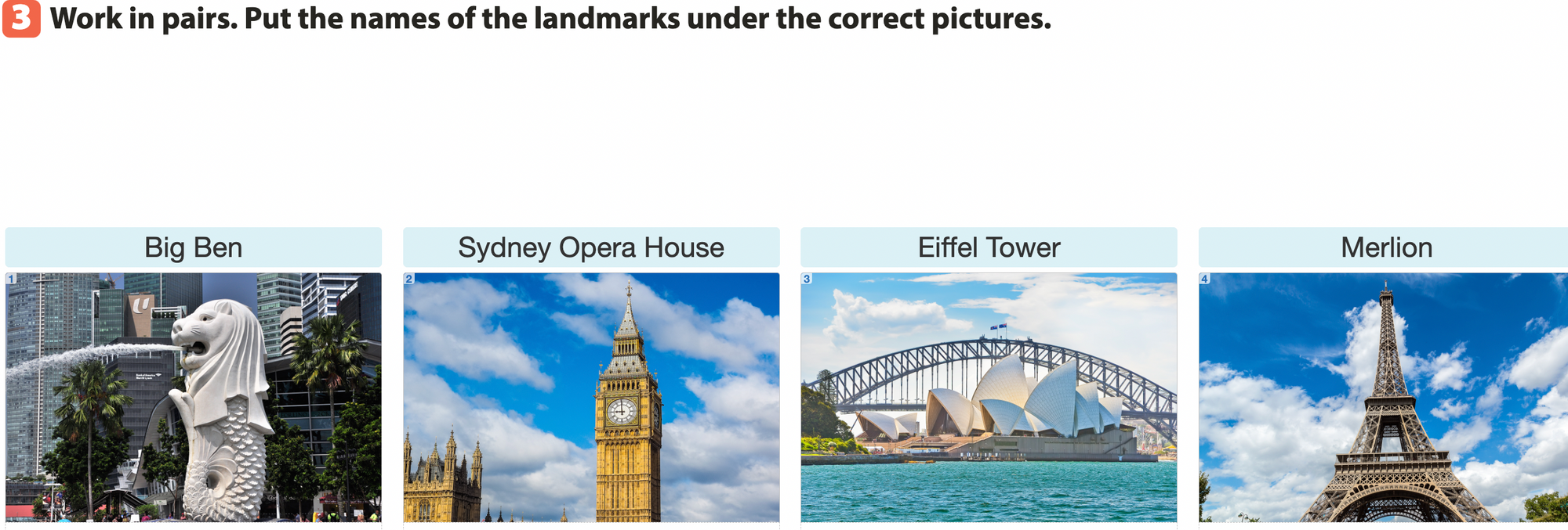 Bài 3. Work in pairs. Write the names of the landmarks under the correct pictures.