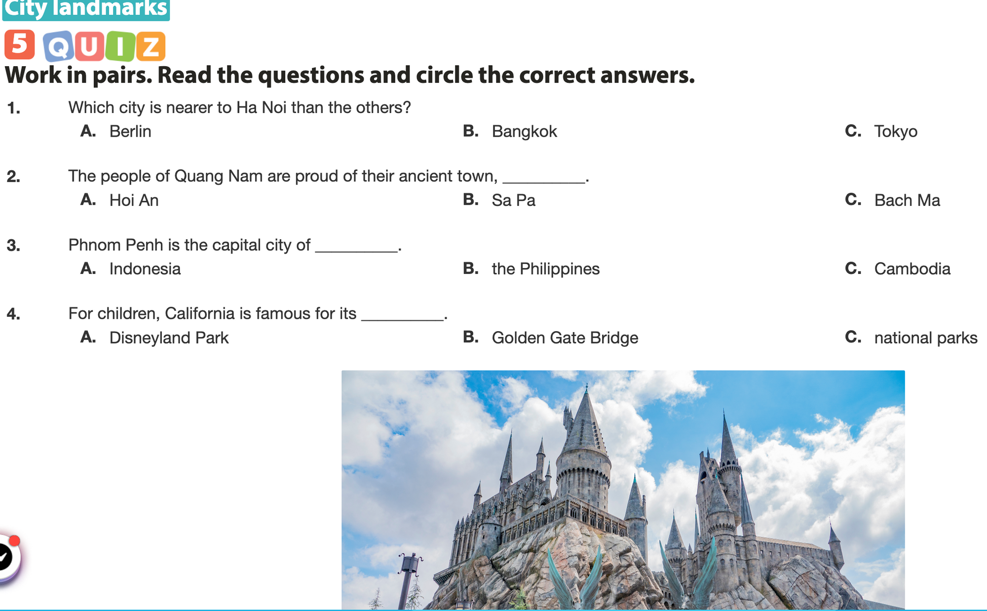 Bài 5. QUIZ. Work in pairs. Read the questions and circle the correct answers.