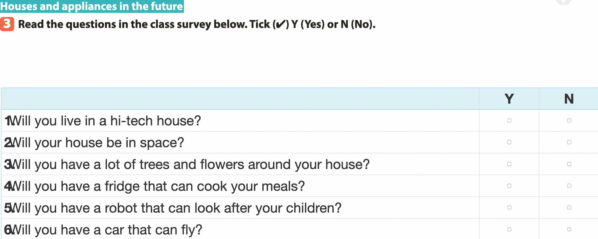 Bài 3. Read the questions in the class survey below. Tick Y (Yes) or N (No).