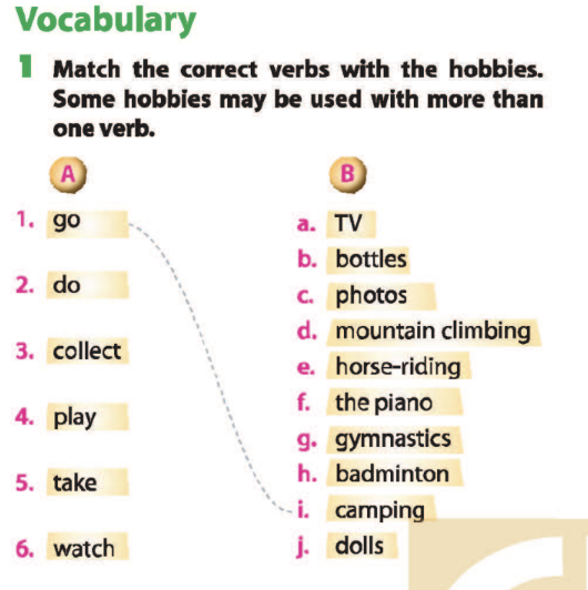 Bài 1. Match the correct verbs with the hobbies. Some hobbies may be used with more than one verb.