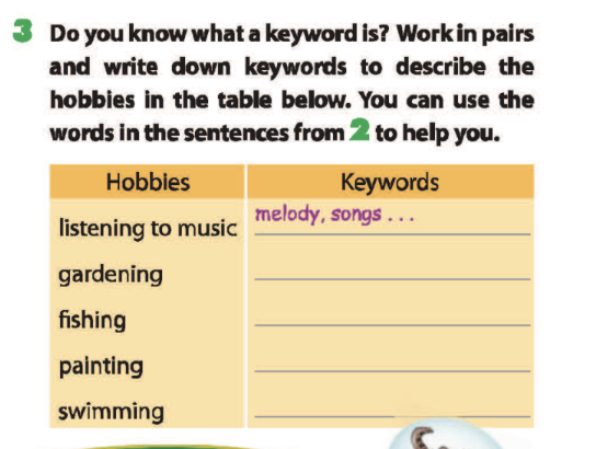 Bài 3. Do you know what a keyword is? Work in pairs and write down keywords to describe the hobbies in the table below. You can use the words in the sentences from 2 to help you.