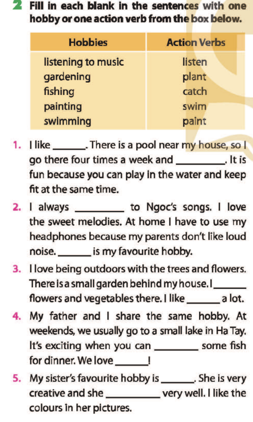Bài 2. Fill in each blank in the sentences with one hobby or one action verb from the box below.
