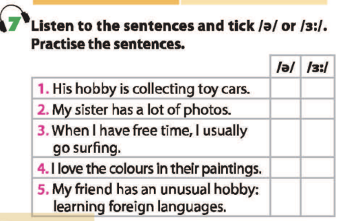 Bài 7. Listen to the sentences and tick /ə/ or /ɜː/. Practice the sentences.