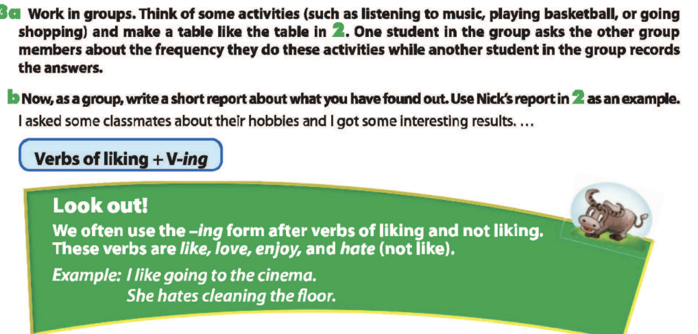 Bài 3a. Work in groups. Think of some activities (such as listening to music, playing basketball, or going shopping) and make a table like the table in 2. One student in the group asks the other group members about the frequency they do these activities while another student in the group records the answers.