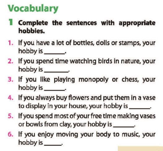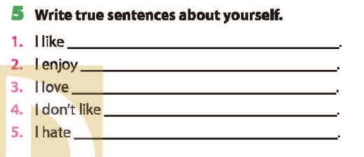 (Hoàn thành các câu sau với những sở thích phù hợp)