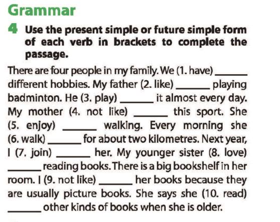 | 6. walks | 7. will join | 8. loves | 9. don’t like | 10. will read |