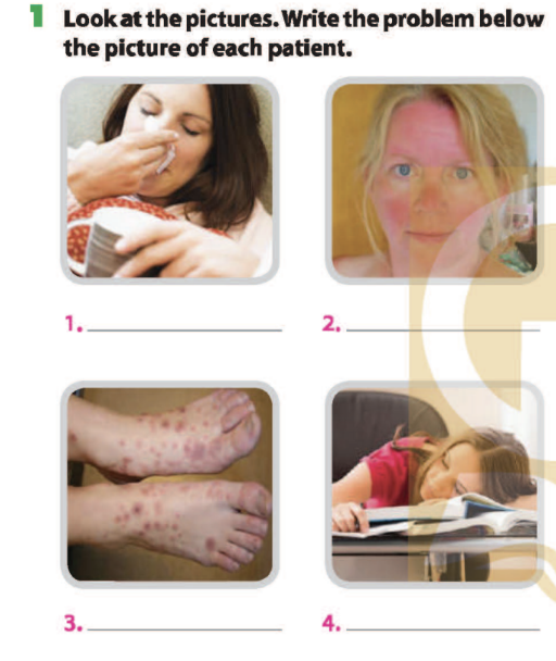 Bài 1. Look at the pictures. Write the problem below the picture of each patient.