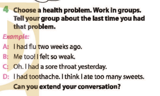 Bài 4. Choose a health problem. Work in groups. Tell your group about the last time you had the problem.