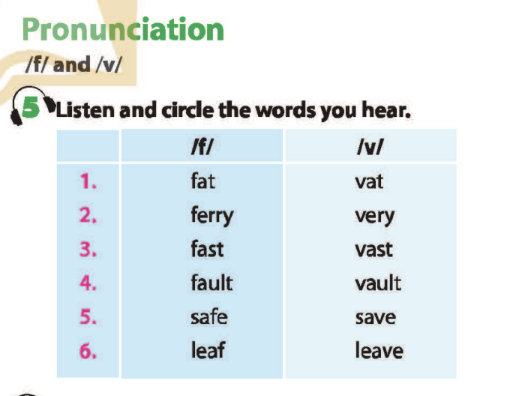 Bài 6. Listen and circle the word(s) with the /f/ or /v/ sounds. Then say the sentences.