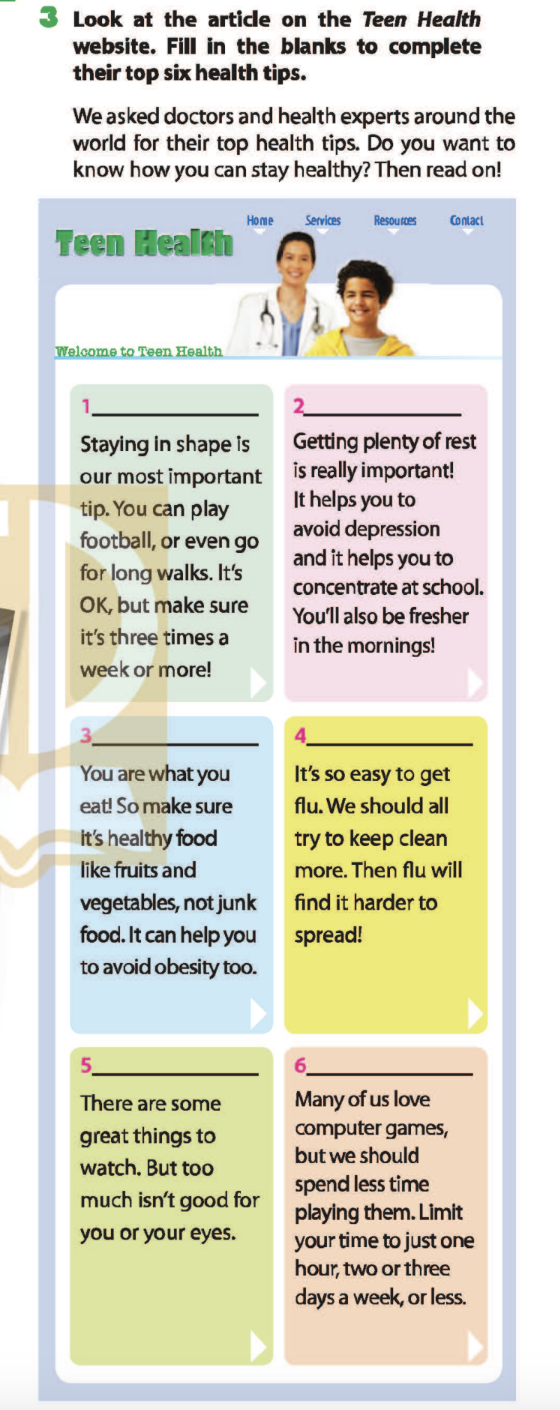 Bài 3. Look at the article on the Teen Health website. Fill in the blanks to complete their top six health tips.