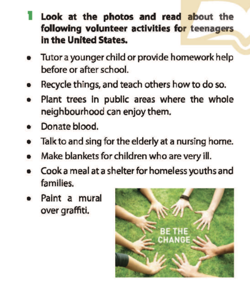 Bài 1. Nhìn vào những bức hình và đọc về những hoạt động tình nguyện của giới trẻ ở Mỹ.