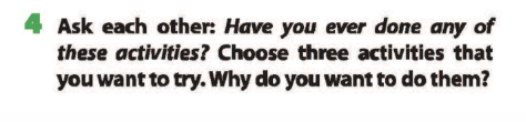 Bài 4. Ask each other: Have you ever done any of these activities? Choose three activities that you want to try. Why do you want to do them?