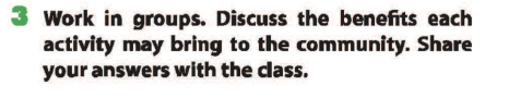 Bài 3. Work in groups. Discuss the benefits each activity may bring to the community. Share your answers with the class.