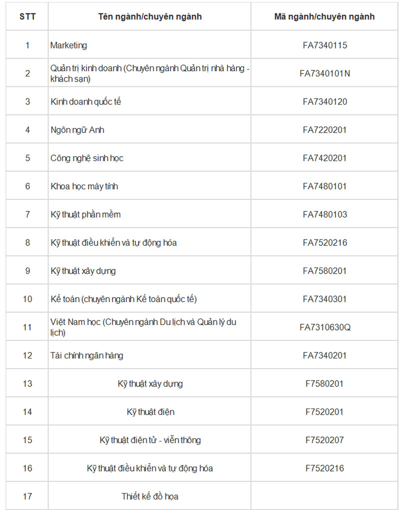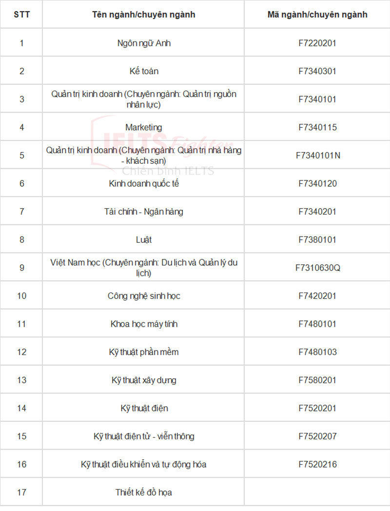 Sắp xếp theo 40 ngành tiêu chuẩn với nhiều ngành, hoạt động đào tạo riêng từ thiết kế đến nghiên cứu. Các bạn có thể xem chi tiết theo bảng dưới đây.