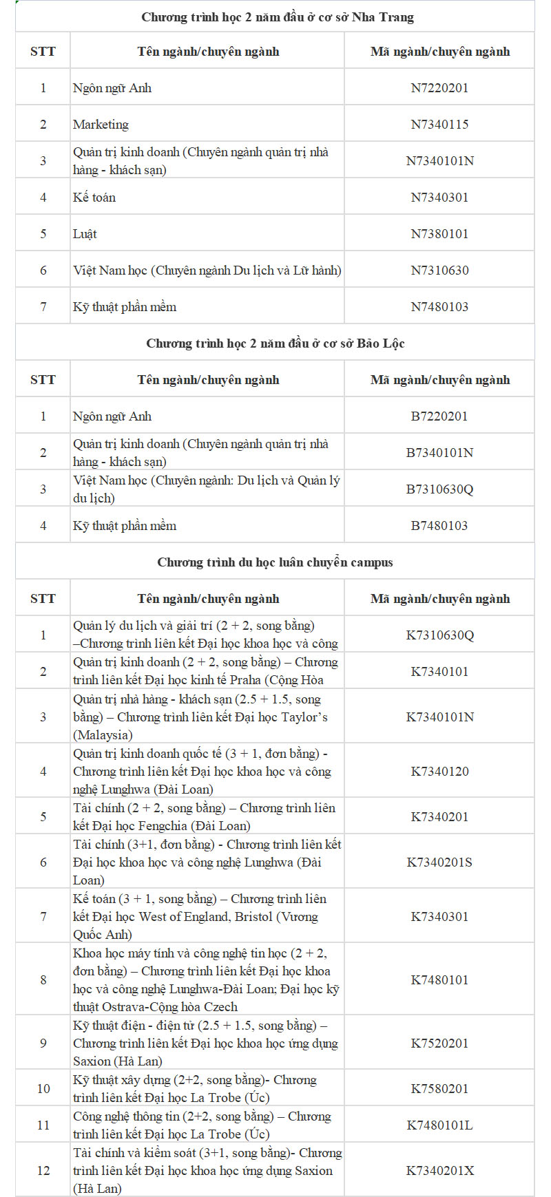 Những chương trình tuyển sinh chuẩn, c lượng cao, phân hiệu khánh Hòa thì đều áp dụng xét tuyển điểm trung bình 5 học kỳ, không tính HK2 lớp 12 theo tổ hợp xét tuyển.