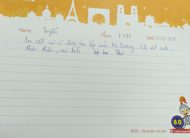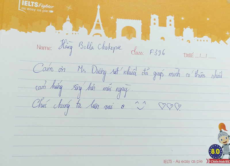Sau thời gian luyện thi IELTS tại trung tâm, các bạn học viên lớp F396 đã chia tay nhau. Có bạn tiếp tục lớp học mới nhưng có bạn vì bận việc nên tự học tại nhà nhưng với tất cả Ms.Dương là No.1, thời gian học tập tại trung tâm là sẽ không bao giờ quên được. Điều đó thể hiện ở những tâm thư "lưu trữ" cùng IELTS Fighter.