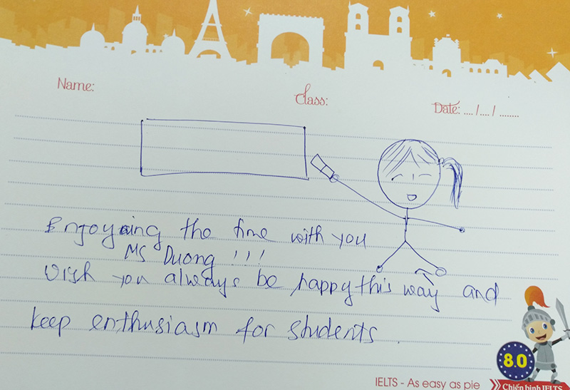 " Enjoying the time with you, Ms.Duong. Wish you always be happy this way and keep enthisiasm for students!" - Em rất thích quãng thời gian học tập cùng cô, Ms.Dương. Chúc cô luôn hạnh phúc và giữ nhiệt huyết truyền lửa, cảm hứng học tập cho các bạn học sinh!