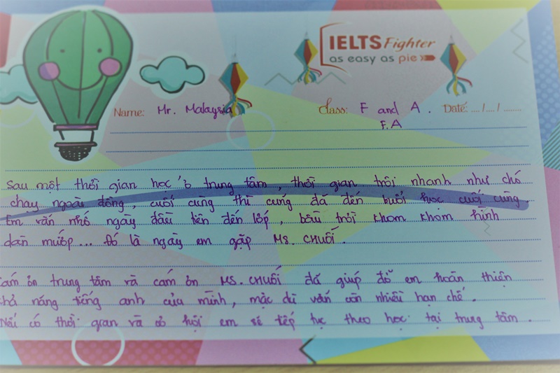 Mr Malaysia – nickname hóm hỉnh đã để lại chia sẻ hài hước: “Em nhớ ngày đầu tiên đến lớp, bầu trời khom khom hình quả mướp là ngày em gặp Ms Chuối. Cám ơn cô và trung tâm đã giúp em hoàn thiện khả năng tiếng Anh của mình. Nếu có cơ hội và thời gian, em vẫn sẽ quay lại học tập tại IELTS Fighter.”