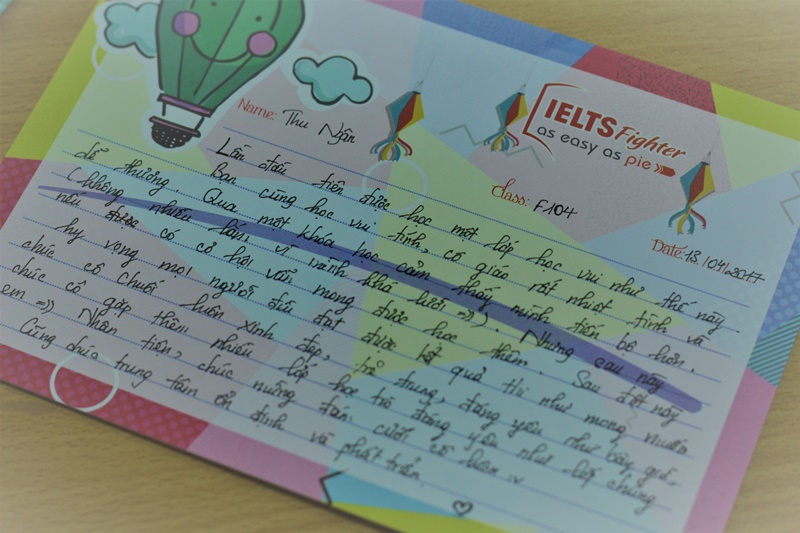 Là một trong những học viên nổi bật của lớp, Đinh Tuấn Hiệp tâm sự: “Sau một thời gian học tập tại Trung tâm, tôi cảm nhận khả năng học tiếng Anh của bản thân tăng lên khá nhiều. Tôi đã có thể tự tin giao tiếp, đọc, viết được nhiều văn bản tiếng Anh hơn. Xin cám ơn đội ngũ tư vấn viên, giáo viên và trợ giảng tại IELTS Fighter, đặc biệt là cô “Chuối” đã ân cần giảng dạy cho em trong thời gian qua ^^ Đây sẽ là kỷ niệm đáng nhớ trong cuộc đời em ?”
