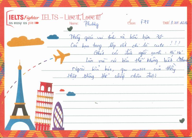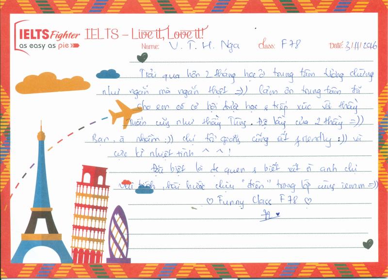 Lời đầu tiên em xin cảm ơn trung tâm Fighter đã tạo điều kiện cho em và các bạn được học trong một môi trường tốt để nâng cao khả năng tiếng Anh của bản thân. Cảm ơn thầy Tuấn và bạn Thoa (trợ giảng F78) đã giảng dạy và hỗ trợ lớp hết sức mình. Mặc dù đi học không đầy đủ, không làm bài tập thường xuyên nhưng cách giảng dạy của thầy, sự nhiệt huyết và giải thích cụ thể của thầy đã giúp em tiến bộ hơn.